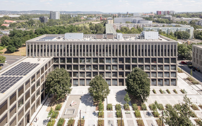 Der neue Lehr- und Laborgebäudekomplex der Hochschule für Technik und Wirtschaft Dresden vervollständigt die orthogonale Struktur des bestehenden Campus aus 50iger Jahren. Das Obergeschoss, die „Krone“, stellt einen markanten städtebaulichen Akzent dar. In ihrer gestalterischen Ausführung interpretiert die Fassade die Formensprache des Prager Kubismus mit Faltung und Fügung.
